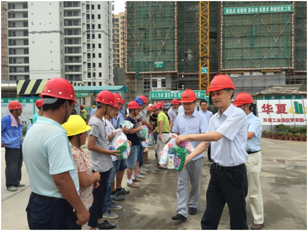 2016年7月27日上午,為切實(shí)做好建筑工地防暑降溫工作,讓施工人員在溫馨的工作環(huán)境中安全作業(yè),園區(qū)黨工委委員、管委會(huì)副主任、規(guī)劃建設(shè)局局長(zhǎng)許紹杰、副局長(zhǎng)張循在開發(fā)公司副總裁劉建華的陪同下冒著酷暑慰問(wèn)夢(mèng)家園工地一線施工人員。