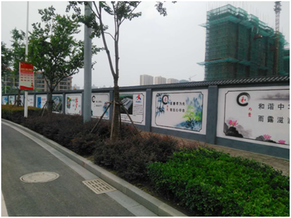 目前,現(xiàn)場各項安全文明設施正在緊鑼密鼓的建設中,其中臨時圍墻不僅是工地對外展示的第一形象,也是企業(yè)宣傳、安全宣傳、方案公示等信息的展示平臺。項目部通過人工手繪結(jié)合局部噴繪的方式既宣傳了創(chuàng)文、創(chuàng)衛(wèi)、核心價值觀的標語,又營造了“青磚綠瓦”的江南韻味。為園區(qū)的創(chuàng)文建設增添了新的亮點。
