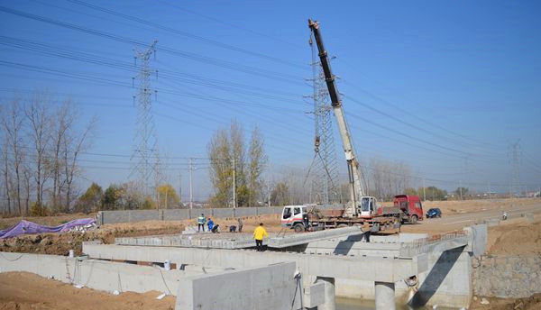 近日,可達(dá)科技配套項目天柱山路跨民便河橋梁10米空心板梁正式開始吊裝。