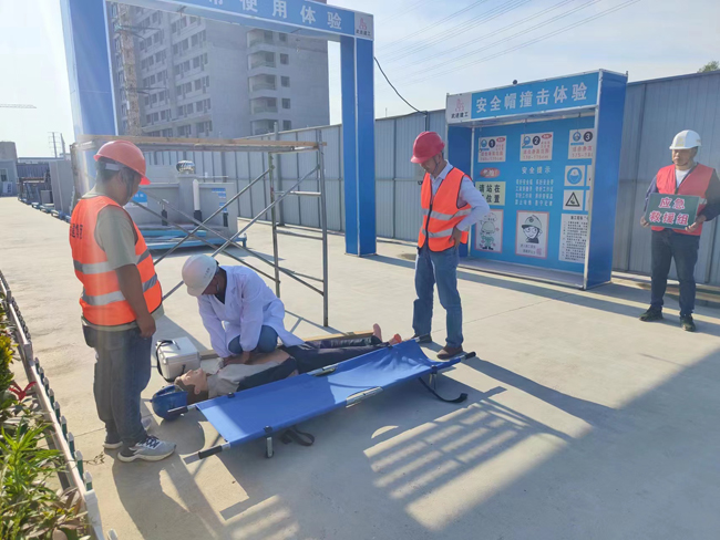 此次演練模擬一名內(nèi)墻抹灰人員在場地上行走, 突然有木方從高處墜落,造成物體打擊。現(xiàn)場立即撥打120請求救援,同時立即通知各救援小組趕赴現(xiàn)場啟動應(yīng)急預(yù)案,停止現(xiàn)場施工作業(yè),封鎖事故現(xiàn)場,注意保護(hù)好受傷人員,防止造成二次傷害。隨后,120救護(hù)車在救援組人員的帶領(lǐng)下來到工地,直接進(jìn)入事故現(xiàn)場,檢查傷員受傷情況。經(jīng)醫(yī)護(hù)人員包扎處理后,受傷人員被迅速用擔(dān)架抬上救護(hù)車,并送往醫(yī)院進(jìn)行救治。
