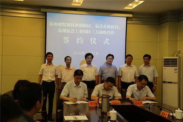 7月21日下午,蘇州獨墅湖科教創(chuàng)新區(qū)管委會、宿遷市科學技術局、蘇州宿遷工業(yè)園區(qū)管委會三方戰(zhàn)略合作協(xié)議簽約儀式在宿遷舉行。根據(jù)協(xié)議,三方將在科技資源轉(zhuǎn)移、科技平臺建設以及科技環(huán)境優(yōu)化等方面推進合作。這是蘇宿兩地合作內(nèi)涵逐步深化、合作領域不斷拓寬、合作水平全面提升的重要體現(xiàn),更是深入貫徹落實省委、省政府部署的重要舉措。市委副書記、市長王天琦,副市長、蘇宿工業(yè)園區(qū)黨工委書記、管委會主任方文浜,市政府秘書長章其波見證簽約。