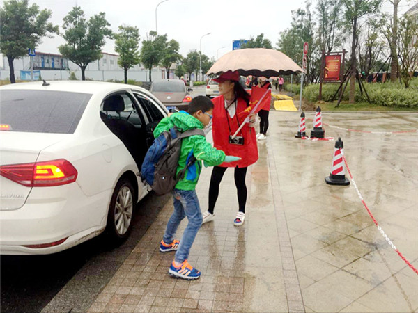10月21日上午,第一組家長志愿者首次上崗,他們在雨中指揮車輛、疏導(dǎo)交通,用實際行動為孩子們撐起了一把“愛心保護傘”。
